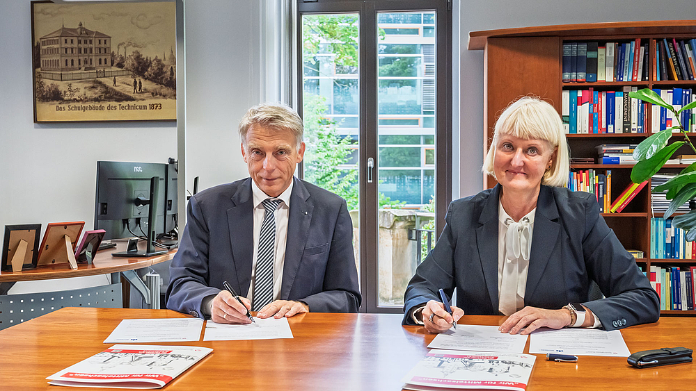Professor Volker Tolkmitt, Rektor der HSMW, und die Vorsitzende der Geschäftsführung der Agentur für Arbeit Freiberg, Kathrin Groschwald, unterzeichneten die Vereinbarung am 18. September in Mittweida.