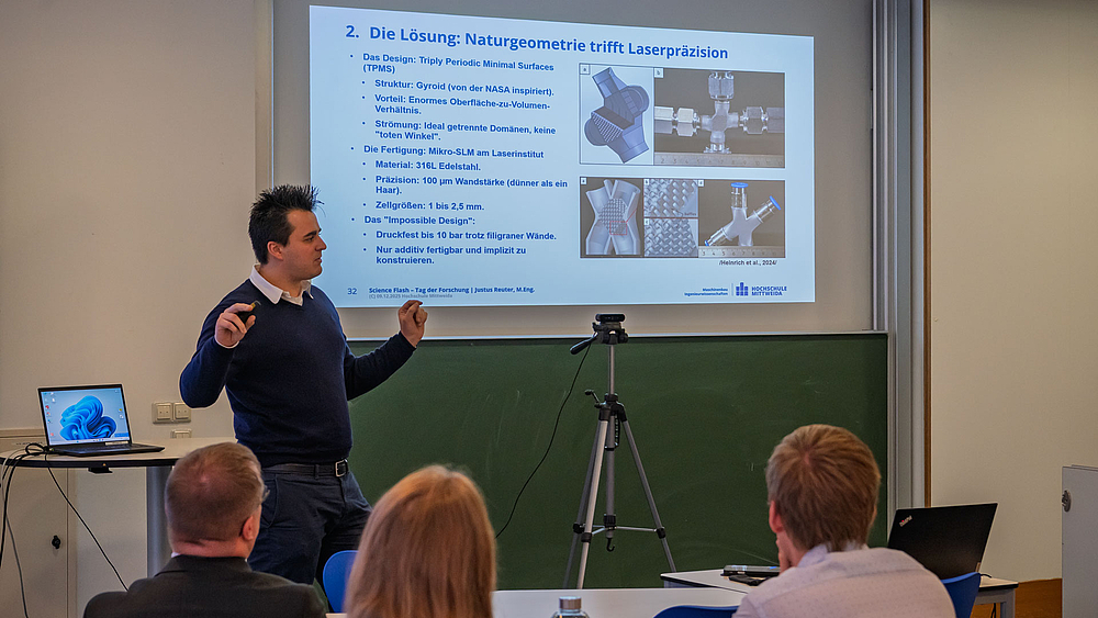 Der zweitplatzierte Justus Reuter von der Fachgruppe Konstruktion an der Fakultät INW trat mit seinem Forschungsthema „Numerische Simulation der Wärmeübertragung und Auslegung von additiv gefertigten Wärmeübertragern“ an. Energieeffiziente, leichte und kompakte Wärmeübertrager sind für Luft- und Raumfahrt, Leistungselektronik und Energietechnik entscheidend. Klassische Übertrager erreichen nur Wärmeübergangskoeffizienten von ca. 4 kW/(m²·K) und lassen sich schwer miniaturisieren. Sogenannte Triply Periodic Minimal Surfaces (TPMS) wie der Gyroid, den zum Beispiel auch Schmetterlingsflügel aufweisen, haben durch ihre periodische Geometrie ein sehr günstiges Verhältnis von Oberfläche zu Volumen. Das sorgt für geringen Strömungswiderstand bei hoher mechanischer Stabilität und hervorragender Strömungsführung. Mit dem am Laserinstitut Mittweida (LHM) entwickelten Mikro-SLM-Verfahren können solche Strukturen mit Zellgrößen von 1 bis 2,5 mm und Wandstärken von 100 μm aus Edelstahl gefertigt werden. Ziel: ein Wärmeübergangskoeffizient von 8–12 kW/(m²·K) und geringem Druckverlust, der numerisch optimiert und experimentell validiert wird.